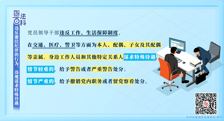 《中国共产党纪律处分条例》第一百零九条规定,党员领导干部违反工作、生活保障制度,在交通、医疗、警卫等方面为本人、配偶、子女及其配偶等亲属、身边工作人员和其他特定关系人谋求特殊待遇,情节较重的,给予警告或者严重警告处分;情节严重的,给予撤销党内职务或者留党察看处分。