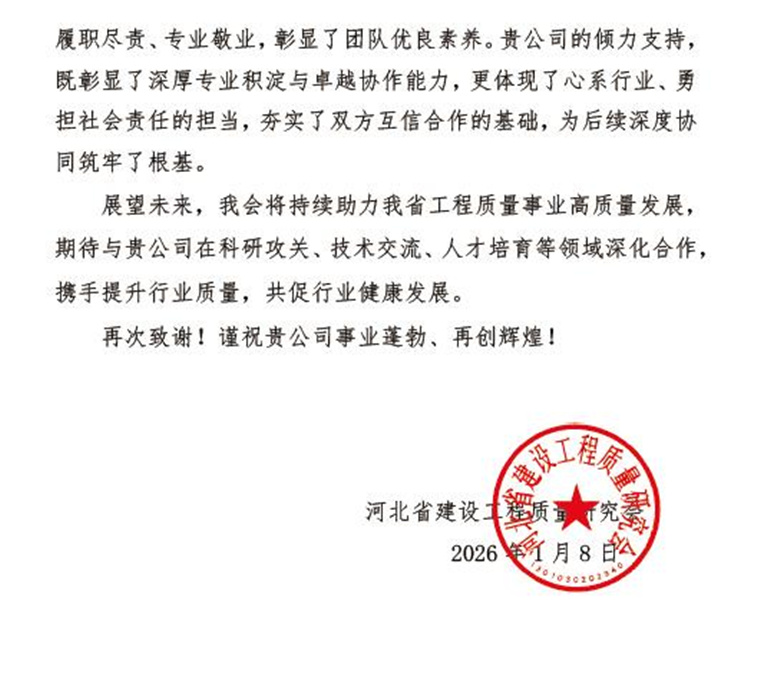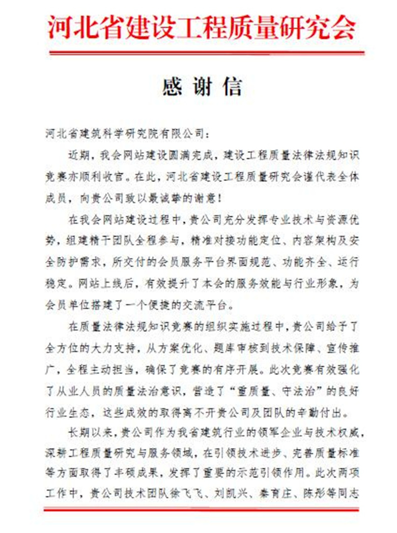 1月8日我公司收到来自河北省建设工程质量研究会的感谢信。信中对我公司为研究会网站建设、质量法律法规知识竞赛等提供的技术服务给予了高度评价,对我公司和全体项目组成员表达了最诚挚的谢意。