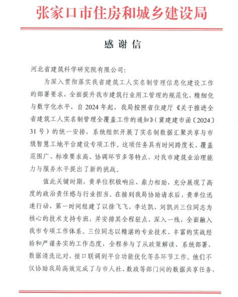 1月9日我公司收到来自张家口市住房和城乡建设局的感谢信。信中对我公司在张家口市建筑行业用工管理和智慧工地平台建设方面的工作给予了高度评价,对我公司和全体项目组成员表达了最诚挚的感谢。