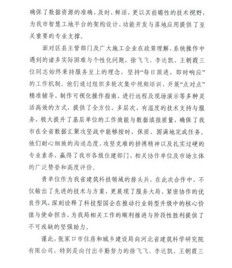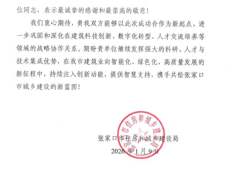 感谢信既是对我公司过去工作的肯定,也是对我公司未来工作的鞭策。我公司将以此次成功合作为新起点,进一步巩固和深化与张家口市住建局在建筑科技创新、数字化转型、人才交流培养等领域的战略协作关系。我公司将继续发挥强大的科研、人才与技术集成优势,持续注入创新动能,提供智慧支持,携手共绘张家口市城乡建设新蓝图!