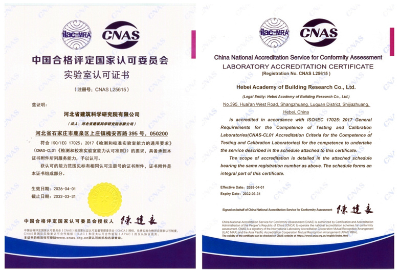 本次认可能力范围覆盖2个检测场所,涉及建筑材料领域钢筋及连接件、水泥、保温材料、防水材料、建筑涂料、门窗型材板材、墙体及屋(地面)材料、材料有害物质等27个检测对象,共计1355项检测参数。其中,石家庄主场所涵盖26个检测对象、1344个参数,检测范围覆盖建筑材料领域的主要品类;灵寿分场所涵盖了1个检测对象、11个参数,检测范围为建筑构件及制品的耐火性能。